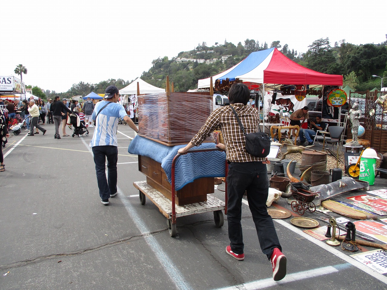 広いフリーマーケット会場で家具を運ぶのは一苦労です。